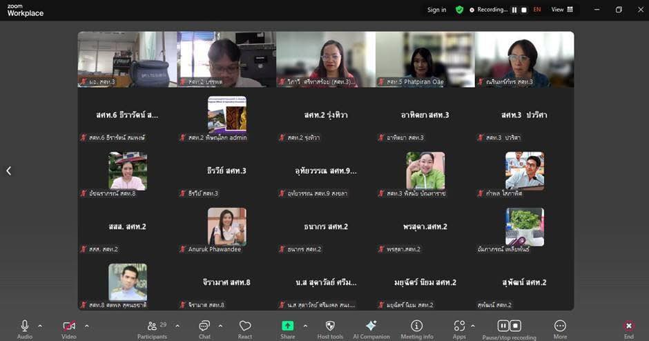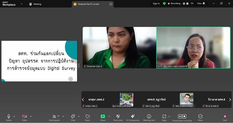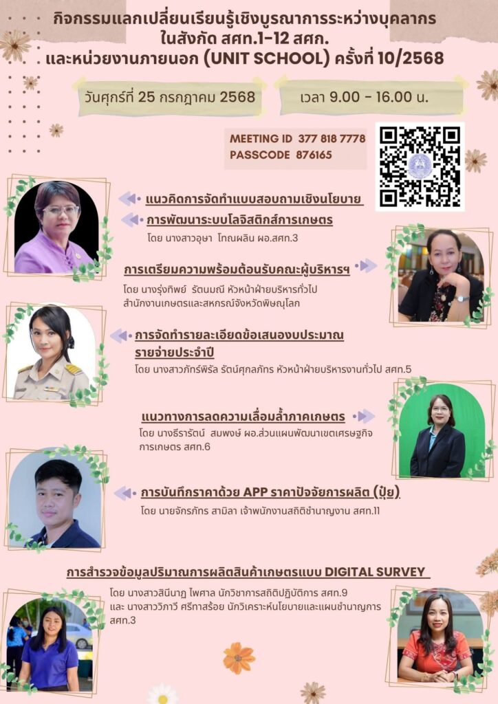 นายไพฑูรย์ สีลาพัฒน์ ผู้อำนวยการสำนักงานเศรษฐกิจการเกษตรที่ 9 ได้มอบหมายให้ นางสาว สินีนาฎ ไพศาล ตำแหน่ง นักวิชาการสถิติปฏิบัติการ ส่วนสารสนเทศการเกษตร เป็นวิทยากรในการบรรยาย กิจกรรมแลกเปลี่ยนเรียนรู้เชิงบูรณาการระหว่างบุคลากรในสังกัด สศท.1-12 และหน่วยงานภายนอก ครั้งที่ 10/2568 ระหว่างบุคลากรในสังกัดสำนักงานเศรษฐกิจการเกษตร ปีงบประมาณ 2568 เรื่อง การสำรวจข้อมูลปริมาณการผลิตสินค้าเกษตรแบบ Digital Survey ผ่าน Application zoom