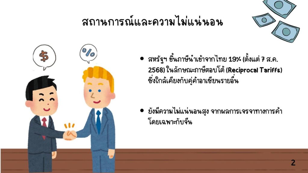 นายไพฑูรย์ สีลาพัฒน์ ผู้อำนวยการสำนักงานเศรษฐกิจการเกษตรที่ 9 ได้มอบหมายให้ นางสาวยศยา นิลอุบล ตำแหน่ง เศรษฐกรปฏิบัติการ สังกัด ส่วนวิจัยและประเมินผล เป็นวิทยากร จัดอบรมการจัดการความรู้ (Knowledge Management : KM ) ประจำเดือน กันยายน 2568 เรื่อง มาตรการการขึ้นภาษีสหรัฐฯ ต่อไทย ให้กับเจ้าหน้าที่ สศท.9 ณ ห้องประชุม สศท.9 ชั้น 2 สำนักงานเศรษฐกิจการเกษตรที่ 9 อำเภอเมืองสงขลา จังหวัดสงขลา