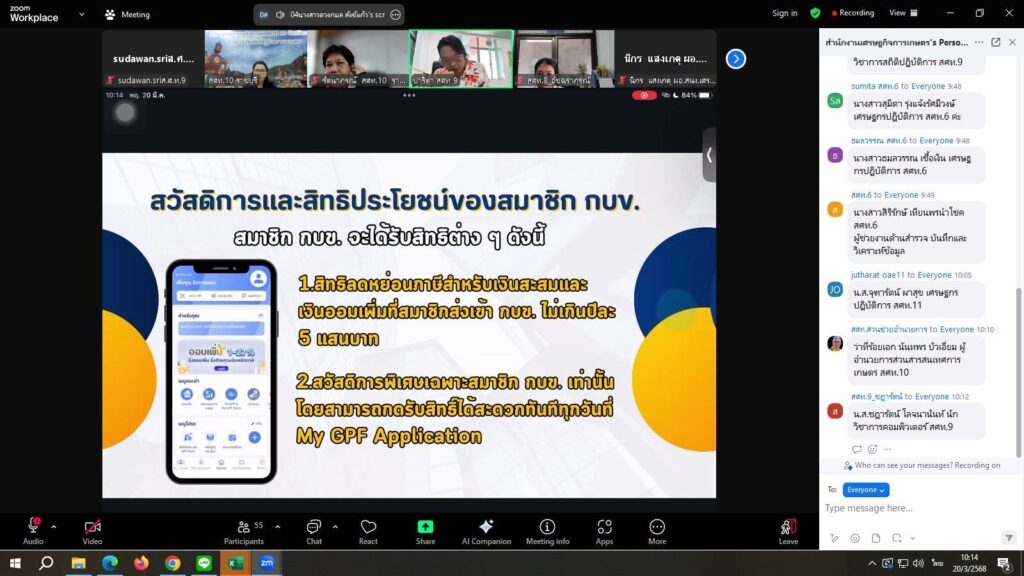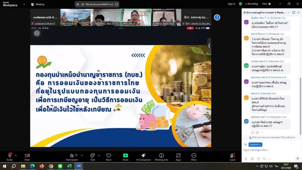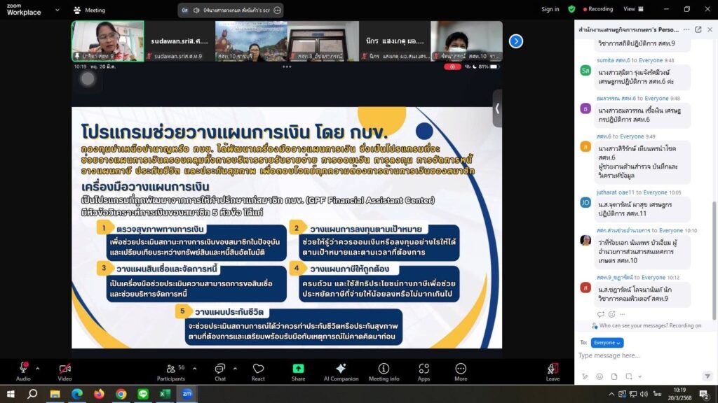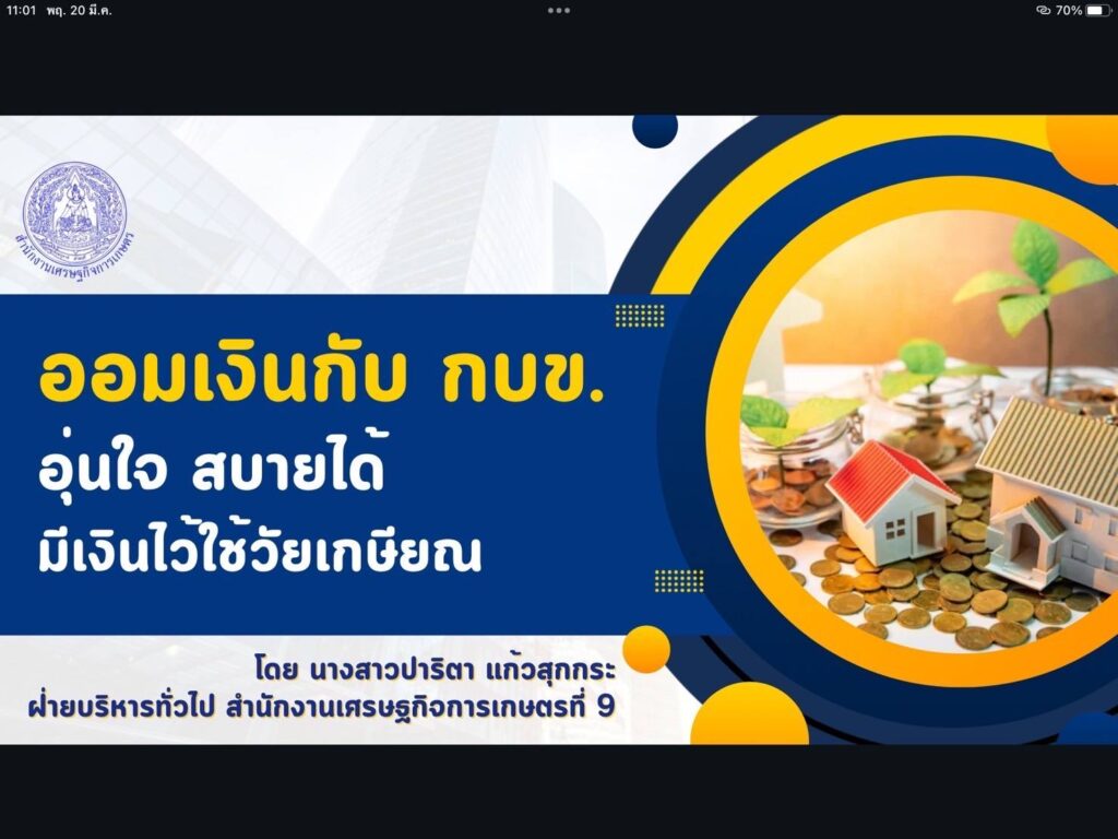 นายไพฑูรย์ สีลาพัฒน์ ผู้อำนวยการสำนักงานเศรษฐกิจการเกษตรที่ 9 ได้มอบหมายให้ นางสาวปาริตา แก้วสุกกระ ตำแหน่ง นักจัดการงานทั่วไปปฏิบัติการ ฝ่ายบริหารทั่วไป เป็นวิทยากรในการบรรยาย กิจกรรมแลกเปลี่ยนเรียนรู้เชิงบูรณาการระหว่างบุคลากรในสังกัด สศท.1-12 และหน่วยงานภายนอก ครั้งที่ 6/2568 ระหว่างบุคลากรในสังกัดสำนักงานเศรษฐกิจการเกษตร ปีงบประมาณ 2568 เรื่อง ออมเงินกับ กบข. อุ่นใจมีเงินไว้ใช้วัยเกษียณ ผ่าน Application zoom