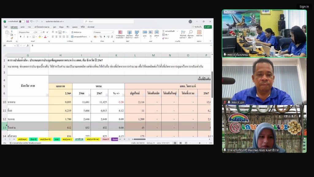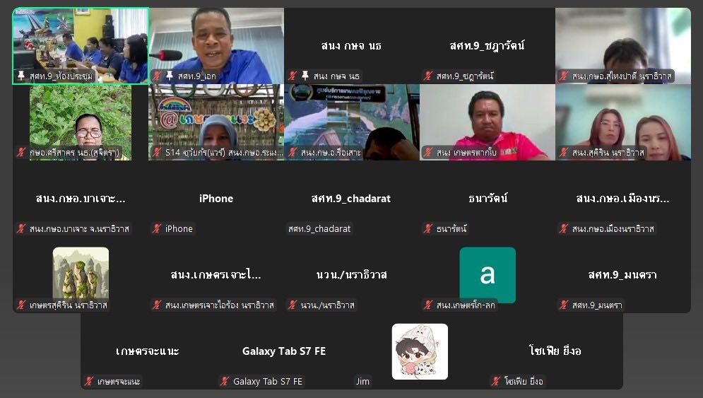 นายไพฑูรย์ สีลาพัฒน์ ผู้อำนวยการสำนักงานเศรษฐกิจการเกษตรที่ 9 (สศท.9)  ได้มอบหมายให้นายเอก แก้วคง นักวิเคราะห์นโยบายและแผน พร้อมด้วยเจ้าหน้าที่ส่วนสารสนเทศการเกษตร สศท.9 ประชุมหารือและพิจารณาข้อมูลเอกภาพยางพารา ปาล์มน้ำมัน และมะพร้าวผลแก่ ปี 2567 และข้าวนาปี ปีเพาะปลูก 2567/68 ระดับจังหวัด จังหวัดนราธิวาส  ณ ห้องประชุมชั้น 2 สำนักงานสำนักงานเศรษฐกิจการเกษตรที่ 9 จังหวัดสงขลา และผ่านระบบ Application Zoom