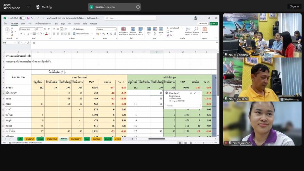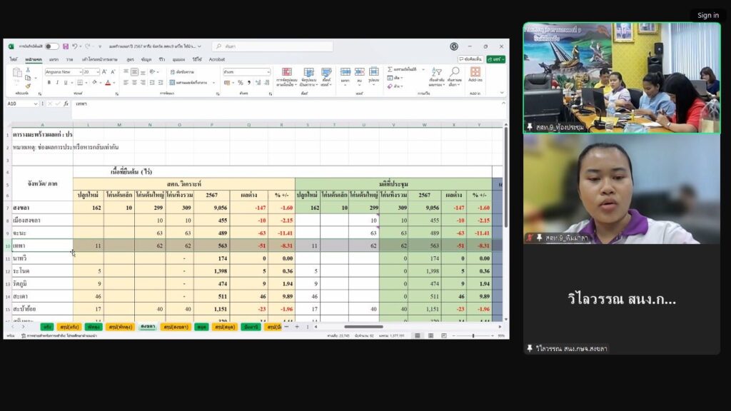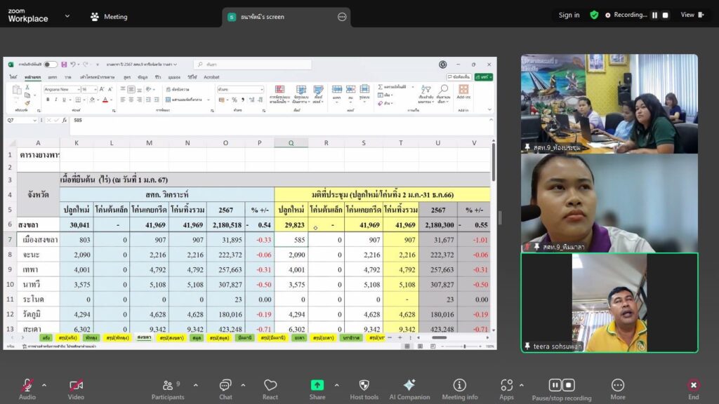 นายไพฑูรย์ สีลาพัฒน์ ผู้อำนวยการสำนักงานเศรษฐกิจการเกษตรที่ 9 (สศท.9) ได้มอบหมายให้นายทนงค์ศักดิ์ ดำรงนุกูล ผู้อำนวยการส่วนสารสนเทศการเกษตร พร้อมด้วยเจ้าหน้าที่ส่วนสารสนเทศการเกษตร สศท.9 ประชุมหารือและพิจารณาข้อมูลเอกภาพยางพารา ปาล์มน้ำมัน และมะพร้าวผลแก่ ปี 2567 ข้าวนาปี ปีเพาะปลูก 2567 /68 และกาแฟ ปี 2568 ระดับจังหวัด จังหวัดสงขลา ณ ห้องประชุมชั้น 2 สำนักงานสำนักงานเศรษฐกิจการเกษตรที่ 9 จังหวัดสงขลา และผ่านระบบ Application Zoom
